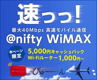 速っっ!最大40Mbps 高速モバイル通信 @nifty WiMAX 本ページ限定5,000円キャッシュバックWi-Fiルーター1,000円〜のバナー