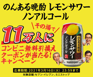 のんある晩酌レモンサワーノンアルコール その場で11万人にコンビニ無料引換えクーポンが当たる!キャンペーンのバナー