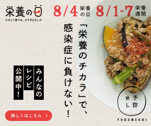 栄養の日 8/4栄養の日 8/1-7栄養週間 予防めし「栄養のチカラ」で、感染症に負けない!みんなのレシピ公開中!のバナー