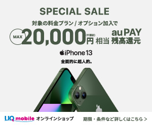SPECIAL SALE 対象の料金プラン/オプション加入でMAX20,000円相当auPAY残高還元 iPhone13 全面的に超人的。UQmobileオンラインショップのバナー