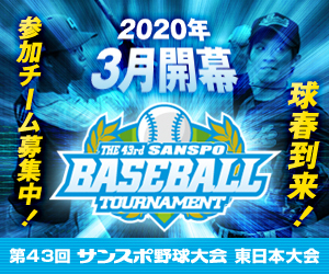2020年3月開幕 THE 43rd SANSPO BASEBALL TOURNAMENT 球春到来!参加チーム募集中!第43回サンスポ野球大会東日本大会のバナー