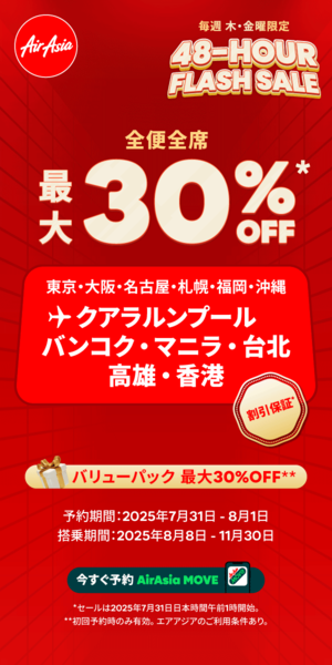 Air Asia 毎週木・金曜限定 48-HOUR FLASH SALE 全便全席最大30%OFF 東京・大阪・名古屋・札幌・福岡・沖縄 クアラルンプール・バンコク・マニラ・台北・高雄・香港のバナー