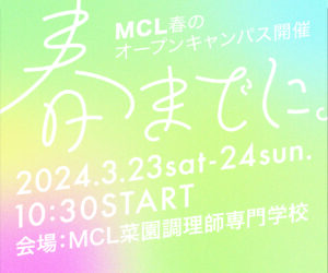 MCL春のオープンキャンパス開催 春までに。2024.3.23sat-24sun.10:30START 会場:MCL菜園調理師専門学校のバナー