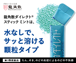 龍角散ダイレクトスティックミントは、水なしで、サッと溶ける顆粒タイプのバナー