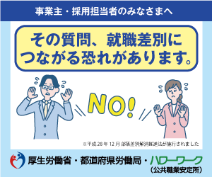 事業主・採用担当者のみなさまへ その質問、職業差別につながる恐れがあります。厚生労働省・都道府県労働局・ハローワークのバナー